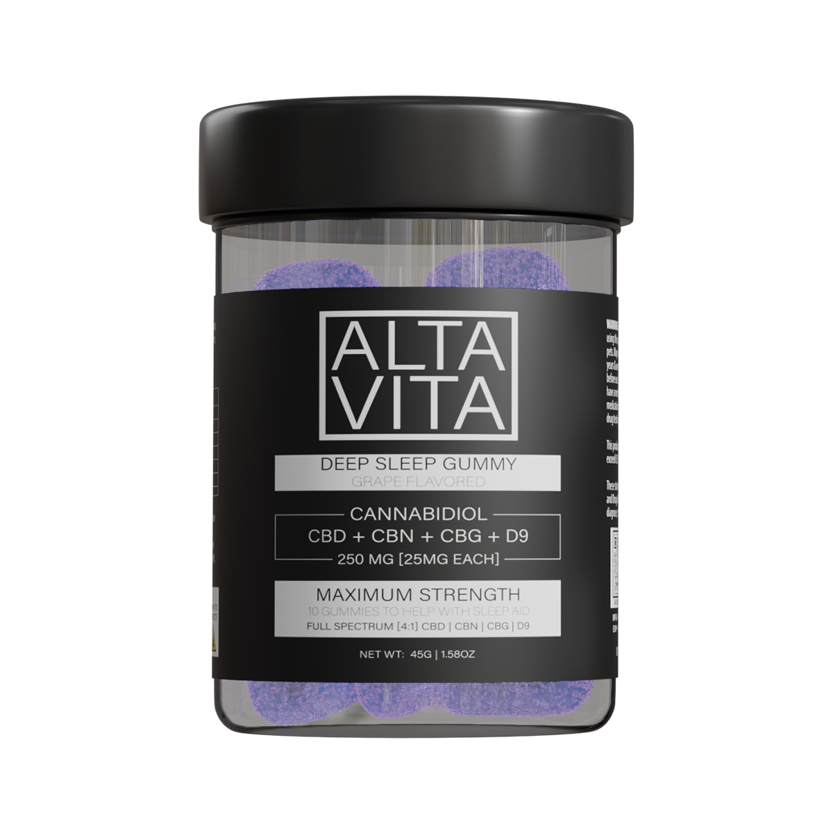 Experience deep, restful sleep with Alta Vita Deep Sleep Gummies. These gummies are infused with CBD, CBN, CBG, Delta 9, expertly formulated to promote relaxation and improve sleep quality. Say goodbye to restless nights and wake up feeling refreshed.